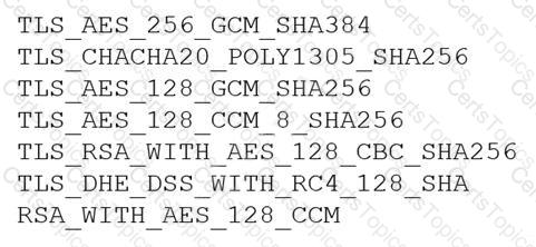 Which of the following ciphers should the security analyst remove to support the business requirements?