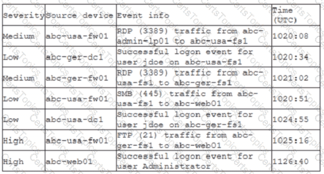 A company recently deployed a SIEM and began importing logs from a firewall, a file server, a domain controller a web server, and a laptop. A security analyst receives a series of SIEM alerts and prepares to respond. The following is the alert information: