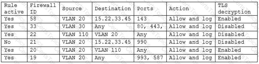 A security engineer has been asked to close all non-secure connections from the corporate network. The engineer is attempting to understand why the corporate UTM will not allow users to download email via IMAPS. The engineer formulates a theory and begins testing by creating the firewall ID 58, and users are able to download emails correctly by using IMAP instead. The network comprises three VLANs:
