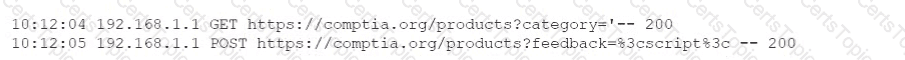 A company is experiencing a large number of attempted network-based attacks against its online store. To determine the best course of action, a security analyst reviews the following logs.