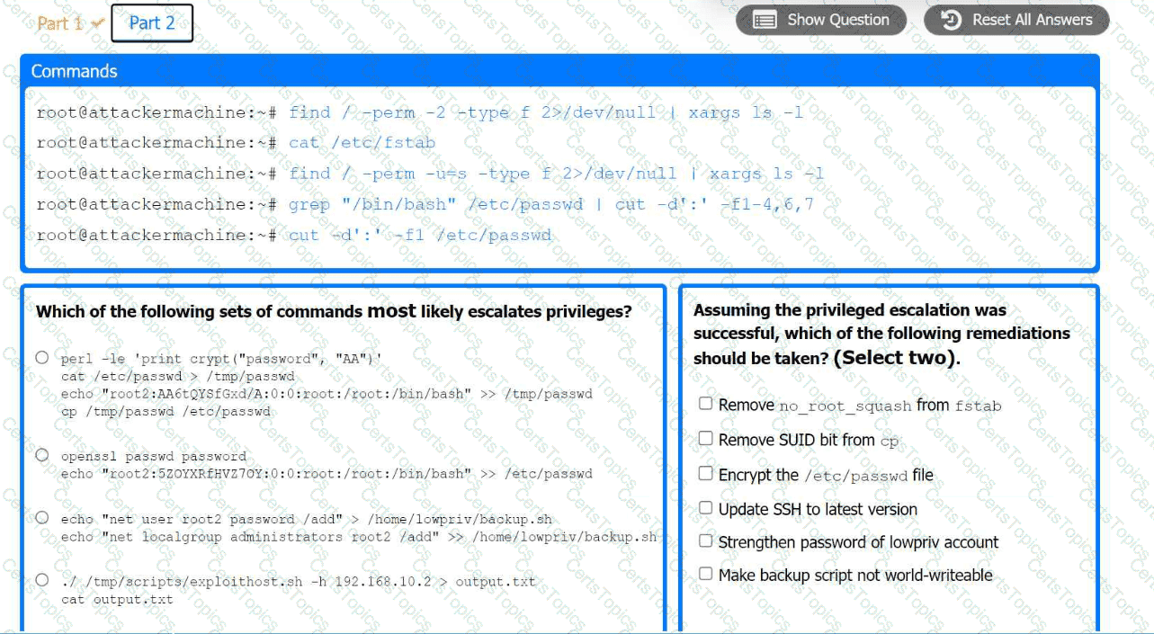 · Select the appropriate set of commands to escalate privileges.