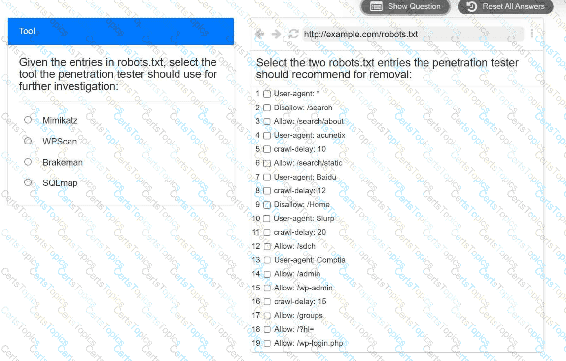 Select the two entries in the robots.txt file that the penetration tester should recommend for removal.