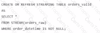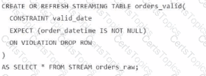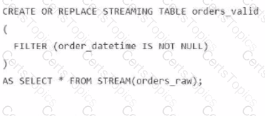 A data engineer is processing ingested streaming tables and needs to filter out NULL values in the order_datetime column from the raw streaming table orders_raw and store the results in a new table orders_valid using DLT.