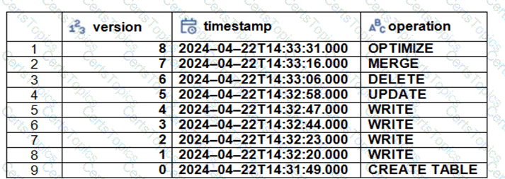 The Delta transaction log for the ‘students’ tables is shown using the ‘DESCRIBE HISTORY students’ command. A Data Engineer needs to query the table as it existed before the UPDATE operation listed in the log.