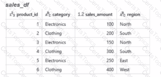 A global retail company sells products across multiple categories (e.g.. Electronics, Clothing) and regions (e.g.. North. South, East. West). The sales team has provided the data engineer with a PySpark dataframe named sales_df as below and the team wants the data engineer to analyze the sales data to help them make strategic decisions.