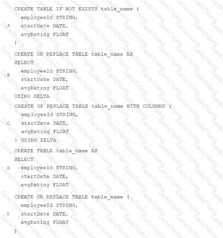 Which of the following code blocks uses SQL DDL commands to create an empty Delta table in the above format regardless of whether a table already exists with this name?