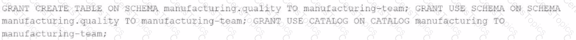 A data engineer needs to provide access to a group named manufacturing-team. The team needs privileges to create tables in the quality schema.