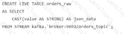 A data engineer streams customer orders into a Kafka topic (orders_topic) and is currently writing the ingestion script of a DLT pipeline. The data engineer needs to ingest the data from Kafka brokers to DLT using Databricks