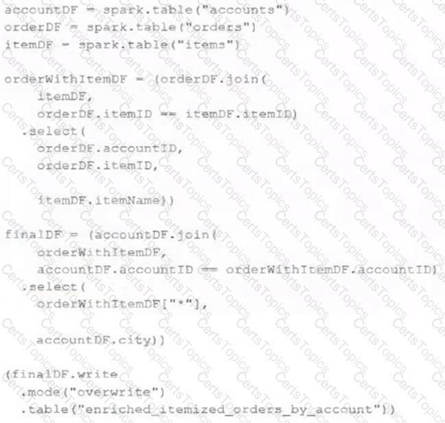 Assuming that this code produces logically correct results and the data in the source tables has been de-duplicated and validated, which statement describes what will occur when this code is executed?