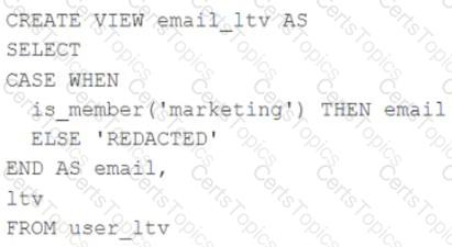 A table named user_ltv is being used to create a view that will be used by data analysts on various teams. Users in the workspace are configured into groups, which are used for setting up data access using ACLs.
