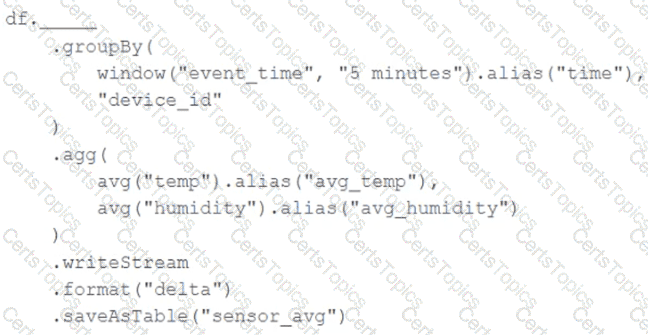 A junior data engineer has been asked to develop a streaming data pipeline with a grouped aggregation using DataFrame df. The pipeline needs to calculate the average humidity and average temperature for each non-overlapping five-minute interval. Incremental state information should be maintained for 10 minutes for late-arriving data.