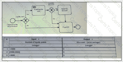 The following BPMN and DMN models are used for acceptance testing. The DMN table is linked to the credit card scanning to check if a discount is applicable.