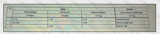 A green courier working for an urban delivery service company uses three types of vehicles: normal bicycles, electric cargo bikes and electric vans. The following DMN table provides the rules used to select the type of zero emission vehicle to be used according to the weight (in kg) and the largest dimension (in cm) of the parcel, and the delivery distance (in km)
