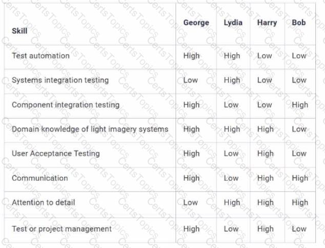 Refer to SCENARIO 2 - You have been tasked with recruiting testers for Project 3 to help design and run regression tests, you have been provided with a skills matrix for four prospective candidates. The matrix shows the skill level (High or Low) for each candidate: