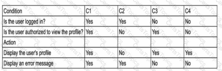 A tester created a decision table(DT) given below. While reviewing the DT some of the actions for the given conditions were found to be incorrect. The user is trying to view the profile, which of the given conditions has CORRECT action(s) listed?