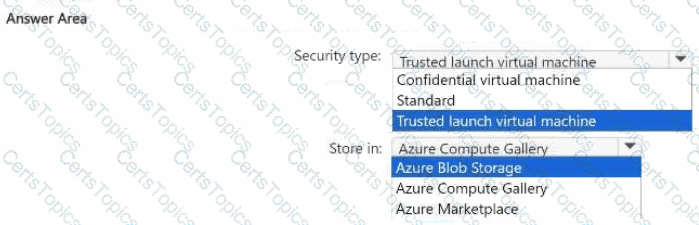 To what should you set Security type for the virtual machines, and where should you store the custom images? To answer, select the appropriate options in the answer area,