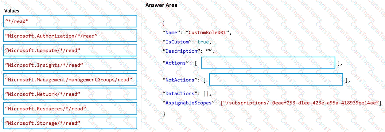 How should you configure the role-based access control (RBAC) role definition? To answer, drag the appropriate values to the correct targets. Each value may be used once, more than once, or not at all. You may need to drag the split bar between panes or scroll to view content.