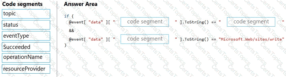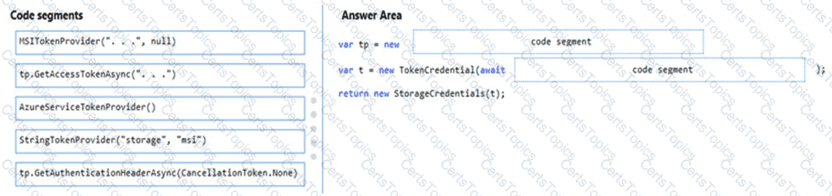 How should you complete the code? To answer, drag the appropriate code segments to the correct locations. Each code segment may be used once, more than once, or not at all. You may need to drag the split bar between panes or scroll to view content.