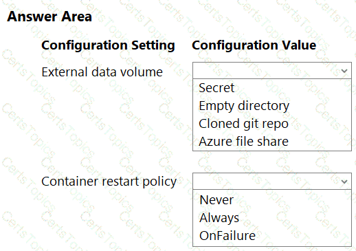 The Python scripts must be deployed to two, separate Linux containers running in an Azure Container Instance container group. The containers must access external data by using the Server Message Block (SMB) protocol. Containers in the container group must run only once