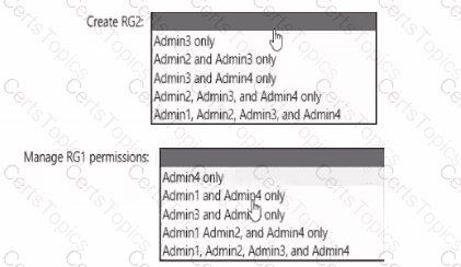 You need to delegate the creation of RG2 and the management of permissions for RG1. Which users can perform each task? To answer select the appropriate options in the answer area. NOTE: Each correct selection is worth one point