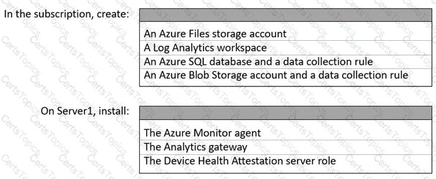 Which resources should you create in the subscription, and what should you install on Server1? To answer, select the appropriate options in the answer area.