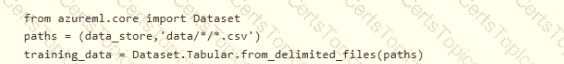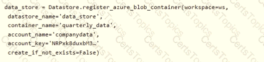 You manage an Azure Machine Learning won pace named workspace 1 by using the Python SDK v2. You create a Gene-al Purpose v2 Azure storage account named mlstorage1. The storage account includes a pulley accessible container name micOTtalnerl. The container stores 10 blobs with files in the CSV format.