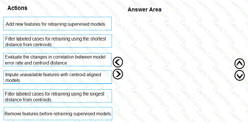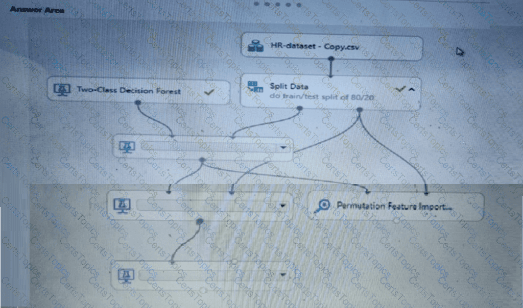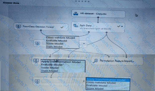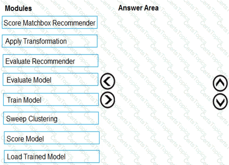 Which three Azure Machine Learning Studio modules should you use in sequence? To answer, move the appropriate modules from the list of modules to the answer area and arrange them in the correct order.