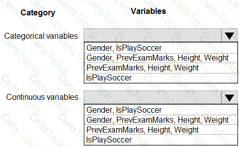 Which variable should you add to each category? To answer, select the appropriate options in the answer area.