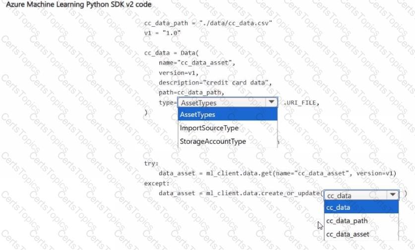 You plan to use Azure Machine Learning Python SDK v2 to store the content of the cc.data.csv file in a data asset named cc_data_asset in the workspace.