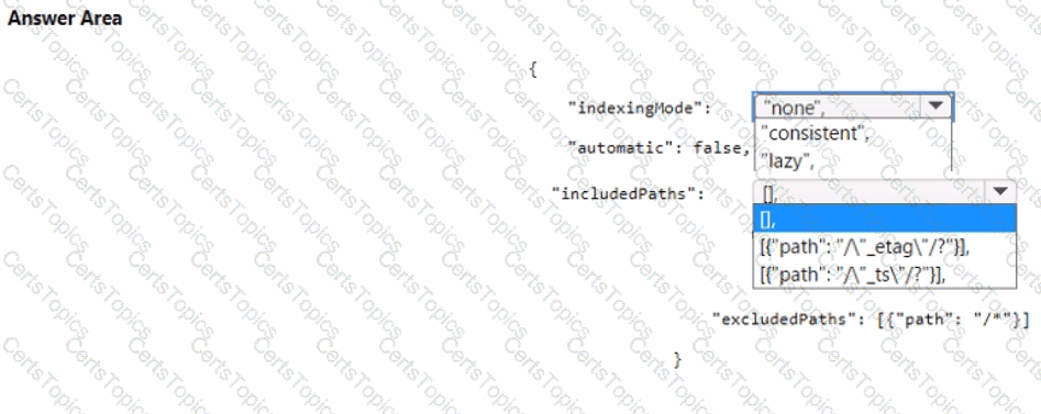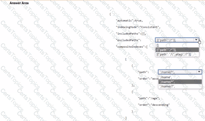 How should you complete the JSON definition of the indexing policy? To answer, select the appropriate options in the answer area.