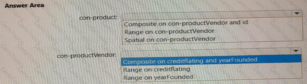 You need to recommend indexes for con-product and con-productVendor. The solution must meet the product catalog requirements and the business requirements.