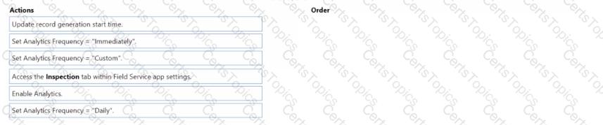 Which three actions should you perform in sequence in the Field Service app? To answer, move the three appropriate actions from the list of actions to the answer area. Arrange the three actions in the order.