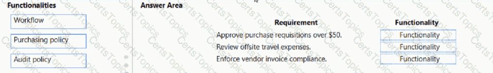 What should you recommend? To answer, drag the appropriate functionalities to the correct requirements. Each functionality may be used once, more than once, or not at all. You may need to drag the split bar between panes or scroll to view content