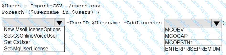 How should you complete the PowerShell script? To answer, select the appropriate options in the answer area.