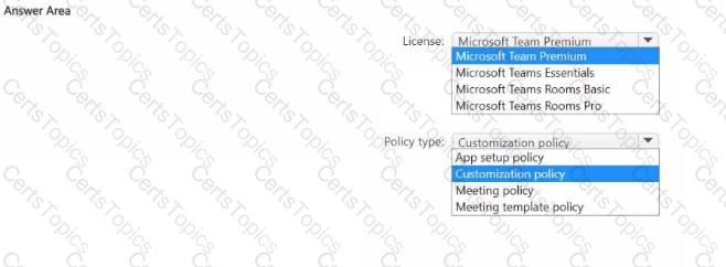 Which license should you acquire, and which type of policy should you configure in the Microsoft Teams admin center? To answer, select the appropriate options in the answer area.