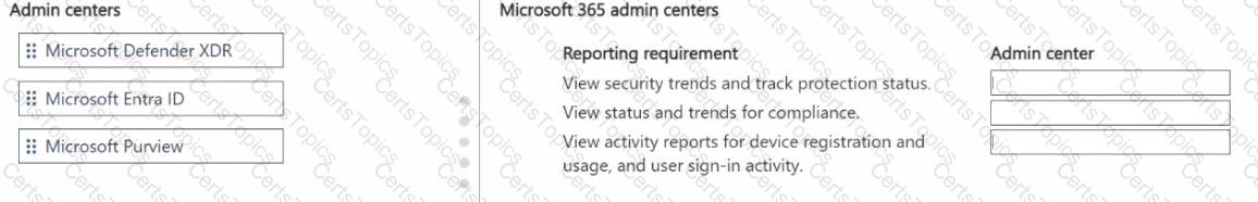 Which admin center should you use? To answer, move the appropriate admin center to the correct reporting requirement. You may use each admin center once, more than once, or not at all. You may need to move the split bar between panes or scroll to view content.