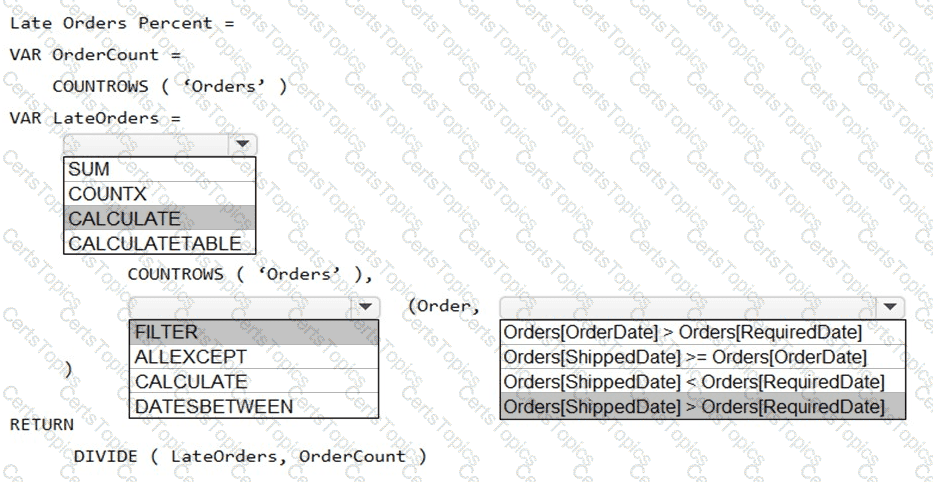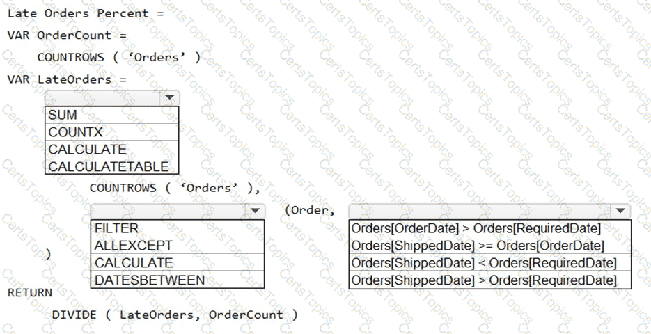 How should you complete the DAX expression? To answer, select the appropriate options in the answer area.