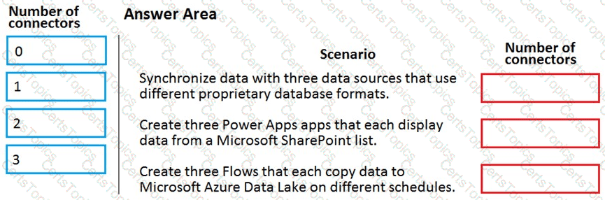 A company plans to create a canvas app that connects to three databases with different proprietary database formats. What is the minimum number of connectors required?