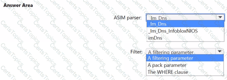 You need to implement the ASIM query for DNS requests. The solution must meet the Microsoft Sentinel requirements. How should you configure the query? To answer, select the appropriate options in the answer area. NOTE: Each correct selection is worth one point.