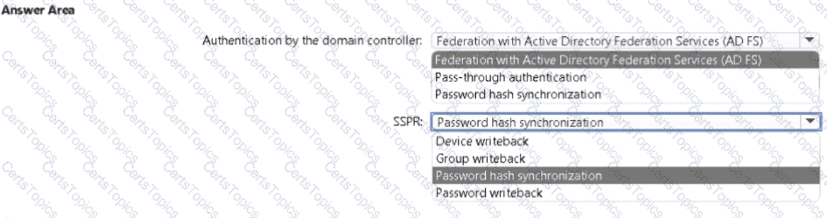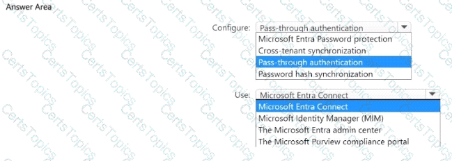 Your network contains an on-premises Active Directory Domain Services (AD DS) domain that syncs with a Microsoft Entra tenant. You need to ensure that user authentication always occurs by validating passwords against the AD DS domain. What should you configure, and what should you use? To answer, select the appropriate options in the answer area. NOTE: Each coned selection is worth one point.