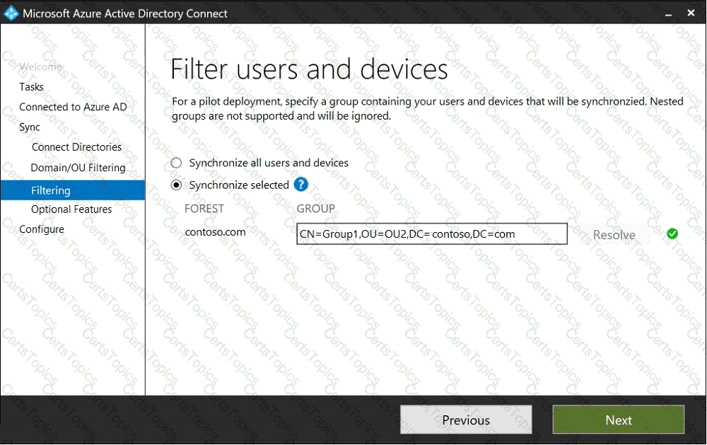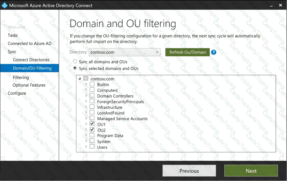 You install Azure AD Connect. You configure the Domain and OU filtering settings as shown in the Domain and OU Filtering exhibit. (Click theDomain and OU Filteringtab.)