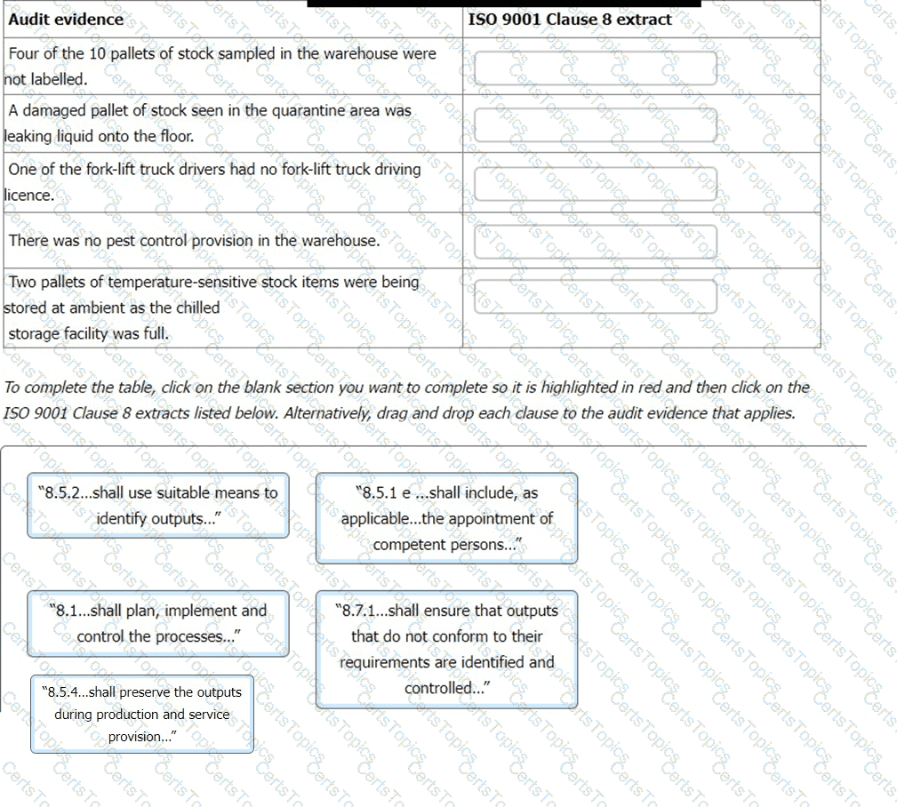 You have gathered audit evidence as outlined in the table. Match the ISO 9001 Clause 8 extract to the audit evidence.