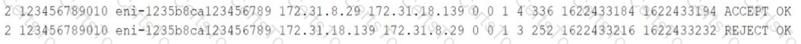 The data scientists report that they can start new instances of the application but that they cannot transfer any data from the on-premises data center. A network engineer enables VPC flow logs and sends a ping to one of the instances to test reachability. The flow logs show the following: