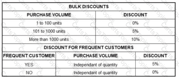 The management of the company “The Big Drop” has instructed the Product Team to configure the discounts in the sales terminals so that frequent customers receive an additional discount on top of a bulk discount, based on the following table: