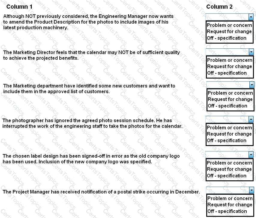 Column 1 contains a number of issues for this project. Select from Column 2 the appropriate category for each issue. Each selection from Column 2 can be used once, more than once or not at all.