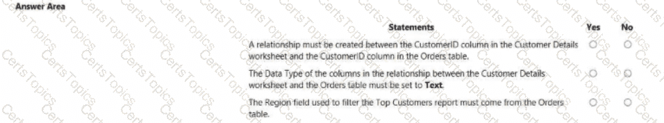 You need to design the data model and the relationships for the Customer Details worksheet and the Orders table by using Power BI. The solution must meet the report requirements.