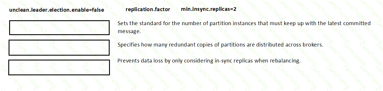 (You are given settings like unclean.leader.election.enable=false, replication.factor, min.insync.replicas=2)