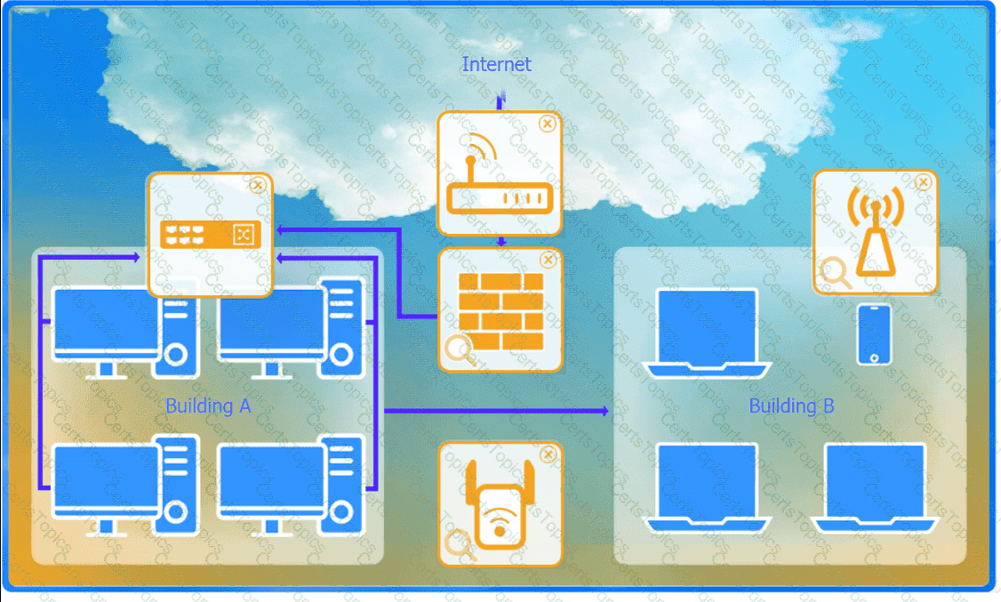 In this corrected setup, the WAP in Building B will connect wirelessly to the Wireless Range Extender, which is connected to the Router. The Router is connected to the Firewall to ensure all traffic is inspected before it enters the network.