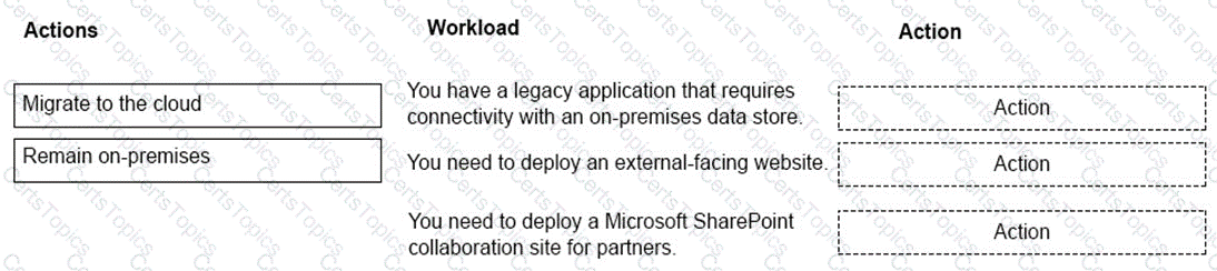 Which workloads you can migrate to the cloud? To answer, drag the appropriate actions to the correct workloads. Each action may be used once, more than once, or not at all. You may need todrag the split bar between panes or scroll to view content.