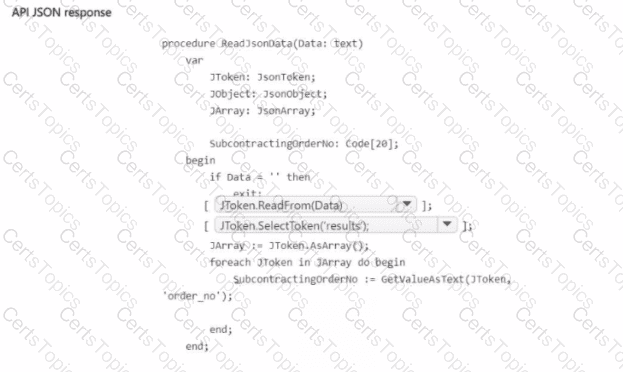 The AL code is trying to read JSON data from a response and process it to extract subcontracting order numbers. It uses JsonToken, JsonObject, and JsonArray to work with the JSON data.